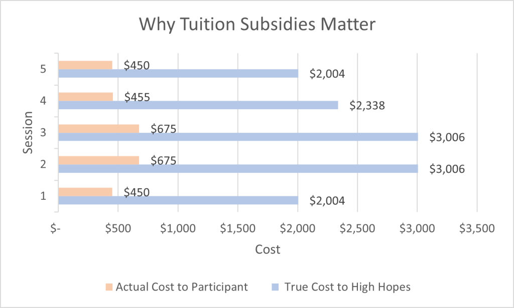 The true direct cost of an unsubsidized High Hopes lesson is $334, meaning the annual, unsubsidized cost is $12,358. The actual average cost to the participant of a subsidized High Hopes lesson is $75, meaning they would only be billed $2,705 annually.